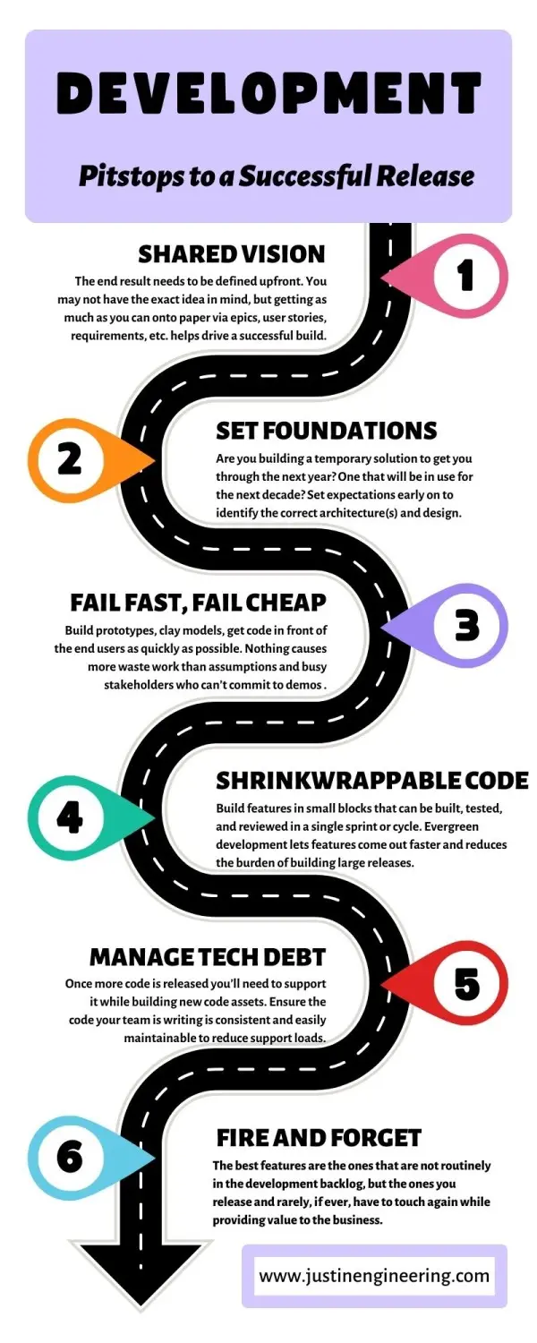 Releasing software successfully is a multifaceted process that requires careful planning, execution, and continuous improvement. By following these six pitstops—Shared Vision, Set Foundations, Fail Fast, Fail Cheap, Shrinkwrappable Code, Manage Tech Debt, and Fire and Forget—you can navigate the complex road of software development with confidence.